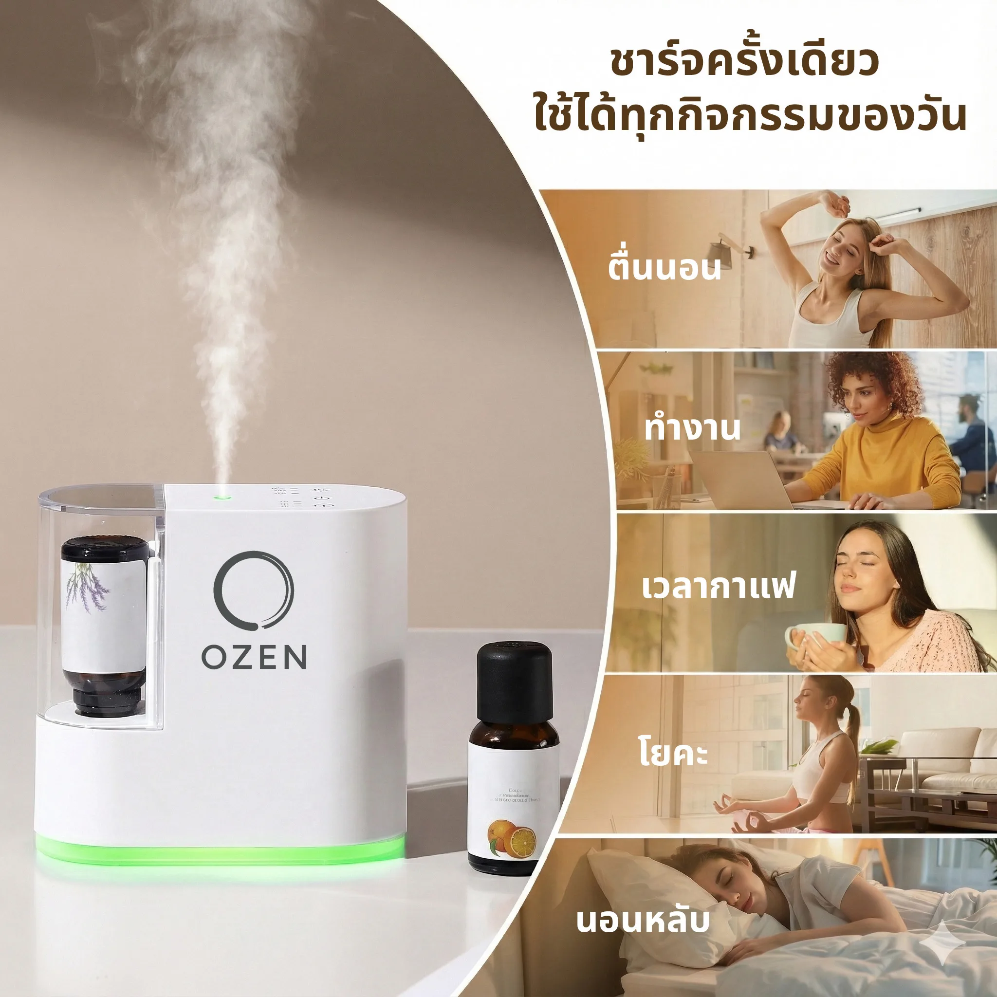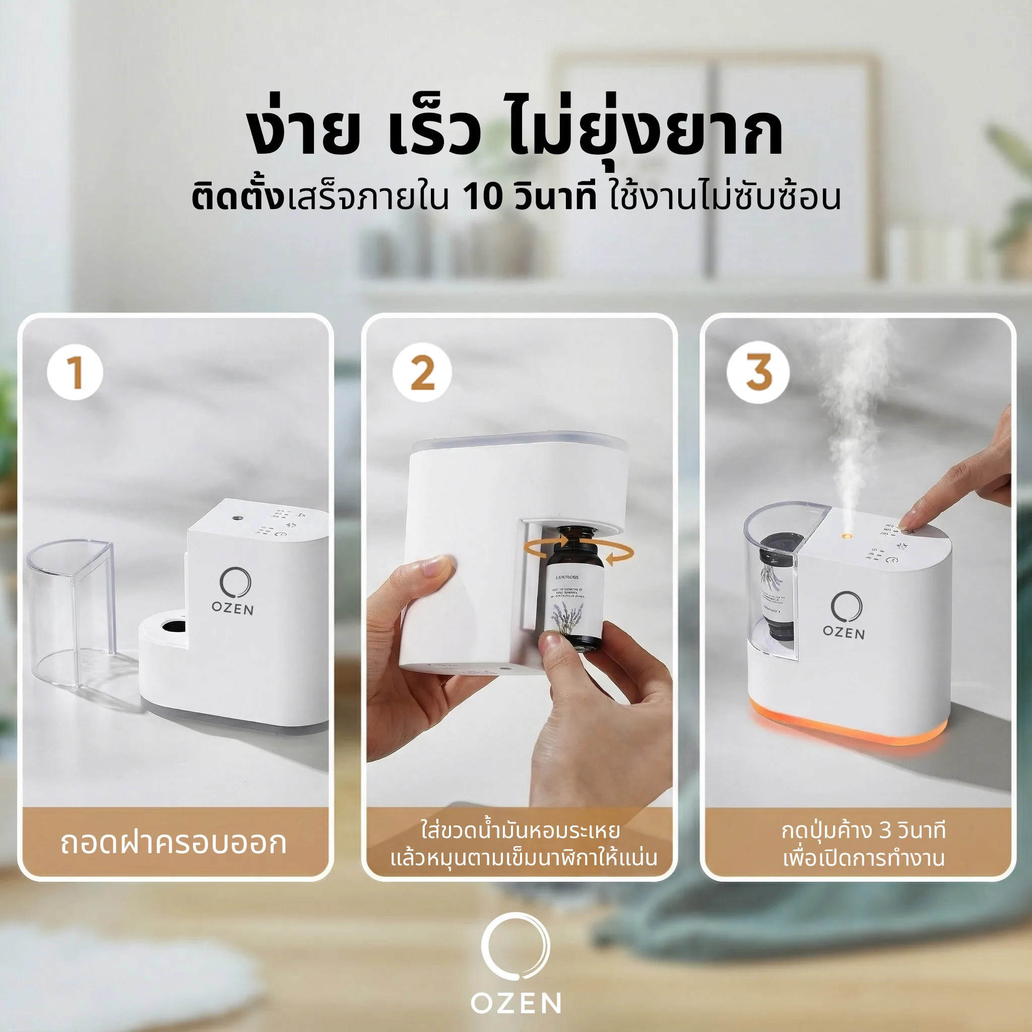OZEN เครื่องพ่นอโรม่าออกแบบมาเพื่อกระจายกลิ่นหอมจากน้ำมันหอมระเหยได้โดยตรง โดยไม่ต้องเติมน้ำและไม่ใช้ความร้อน ช่วยคงเอกลักษณ์ของกลิ่นได้ดี พร้อมใช้งานง่ายเพียงใส่ขวดน้ำมันหอมระเหยและเปิดเครื่อง