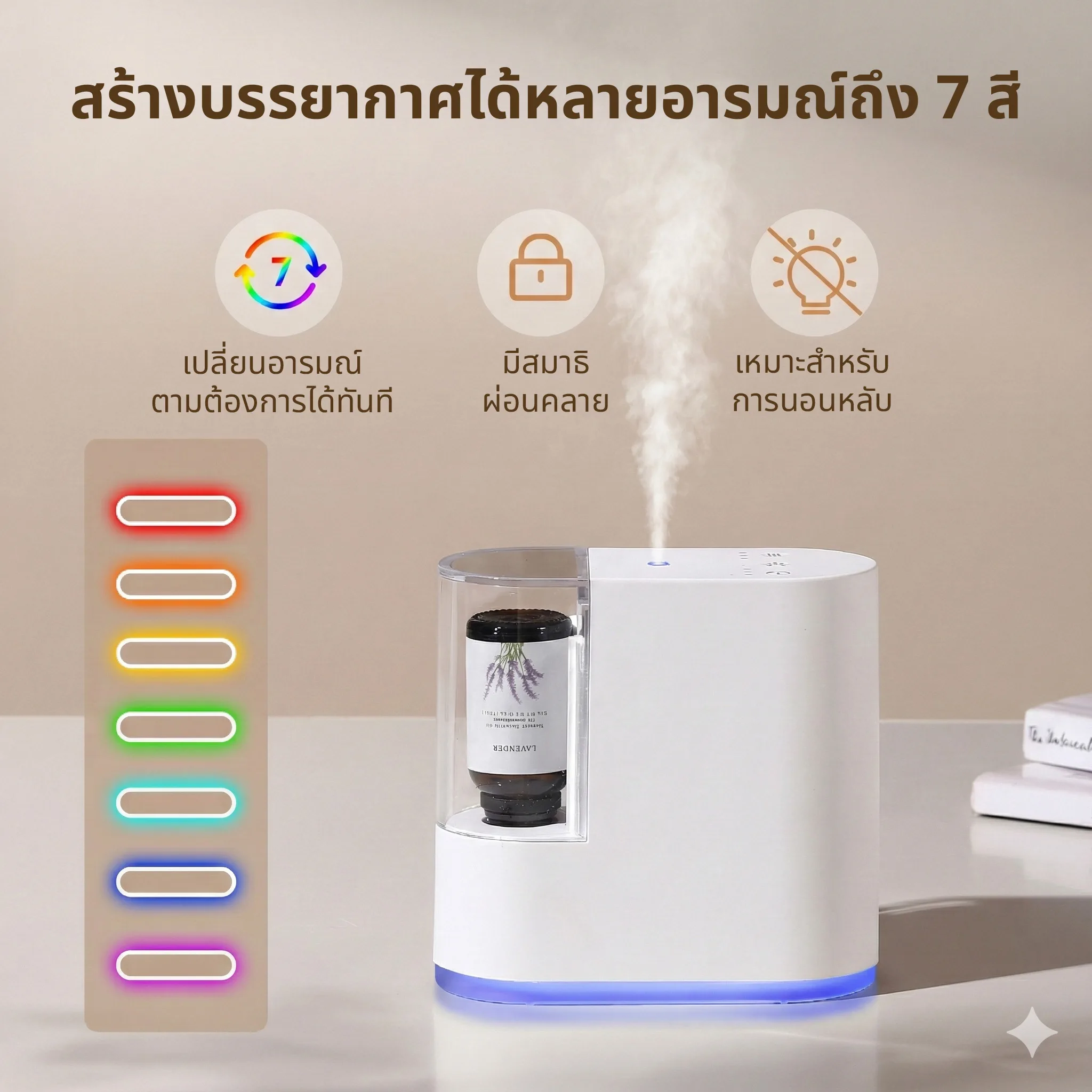 ปรับการพ่นกลิ่นได้ตามต้องการด้วยโหมด Spray ทุกๆ 20s, 40s และ 60s พร้อมไฟสร้างบรรยากาศ 7 สี ช่วยเพิ่มอารมณ์ผ่อนคลาย เหมาะกับการใช้งานในห้องนอน ห้องทำงาน มุมทำสมาธิ หรือพกพาไปใช้ระหว่างเดินทาง