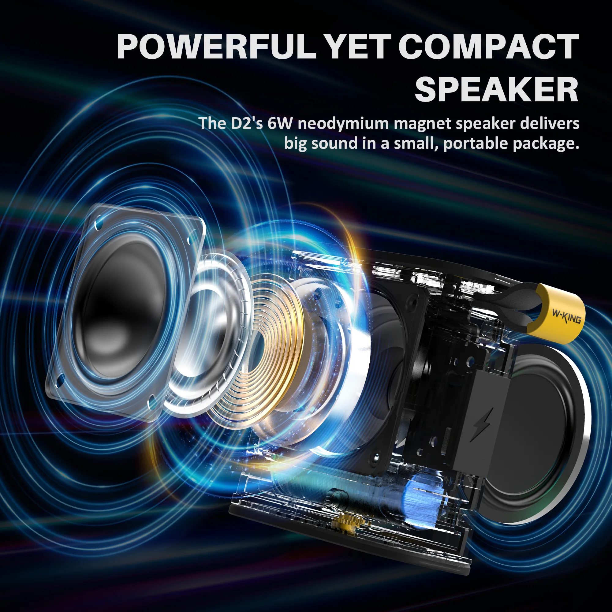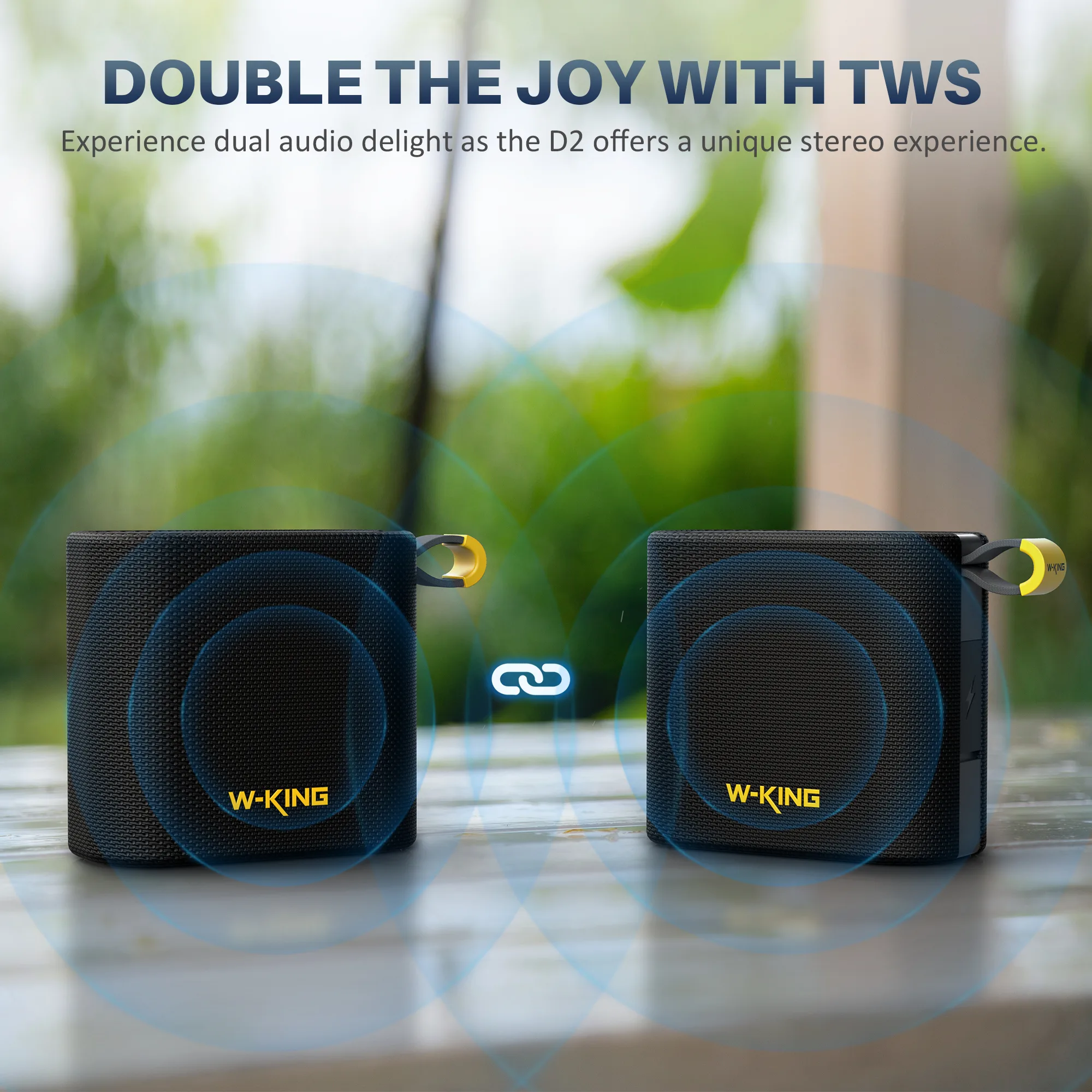 W-King D2 เป็นลำโพงบลูทูธขนาดกะทัดรัดที่ออกแบบมาให้พกพาได้สะดวก เหมาะสำหรับฟังเพลงนอกสถานที่ ใช้งานในบ้าน หรือพกไปทริป ด้วยมาตรฐานกันน้ำ IPX7 รองรับการเชื่อมต่อ Bluetooth 5.3 และมีโหมด Stereo Pairing สำหรับจับคู่ลำโพง 2 เครื่องเพื่อประสบการณ์เสียงที่เต็มขึ้น